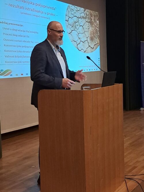 Prvo predavanje pod nazivom „Konzervacijska poljoprivreda, rezultati istraživanja u praksi, prednosti i mogući nedostaci“ održao je redovni profesor Fakulteta agrobiotehničkih znanosti u Osijeku, Danijel Jug koji je govorio o pitanjima degradacije tla te nabrojio glavne prijetnje prema tlu, kao što su zakiseljavanje, onečišćenje, deforestacija, smanjenje bioraznolikosti, gubitak organskog ugljika, zbijenost, disbalans hraniva, erozija… Degradacije tla nam se događaju zbog utjecaja čovjeka i klimatskih promjena. Neodgovarajuće gospodarenje tlom put je ka degradaciji tla. Naglasio je slaganje široke znanstvene zajednice da je plug uzročnik našeg prosperiteta, ali isto tako i problema sa kojima se danas susrećemo. Da bi se spriječio ili barem ublažio učinak klimatskih promjena, potrebno promijeniti pristup obradi tla. Konzervacijska poljoprivreda vodi očuvanju kvalitete tla , uključuje tri osnovna postulata: permanentnu pokrivenost tla, minimalno narušavanje tla obradom te rotaciju usjeva. Predavanje prof. Juga poljoprivrednici su slušali vrlo pozorno i sa zanimanjem te su mogli čuti niz korisnih informacija temeljenih na vlastitim istraživanjima i dugogodišnjem radu o konzervacijskoj poljoprivredi. Predavanje je zaključio riječima: „Što se obrada tla više približava principima konzervacijske poljoprivrede, mogu se očekivati manje štete i potencijalni problemi i rizici. Najbolji sustavi obrade tla su oni koji su najmanje degradirajući“