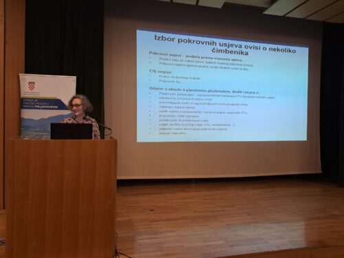 Tatjana Martinović održala je predavanje o pokrovnim usjevima objasnivši razliku između postrnih (siju se nakon žetve ozimih kultura) i pokrovnih usjeva (sjetva tijekom jeseni, ostaju tijekom zime na tlu). Cilj uzgoja takvih usjeva može biti proizvodnja hrane za životinje i ljude, a u današnje vrijeme sve se viši koristi u svrhu poboljšanja kvalitete tla. Naglasila je važnost poštivanja plodoreda kako u sjetvi glavnih kultura tako i u sjetvi sekundarnih usjeva.