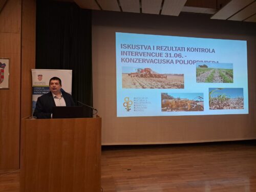 Uslijedilo je predavanje „Iskustva i rezultati kontrola Intervencije 31.06. Konzervacijska poljoprivreda“ koje su održali službenici Agencije za plaćanja u poljoprivredi, ribarstvu i ruralnom razvoju“, Marija Šatović i Josip Bišćanić. Marija Šatović objasnila je obveze za ostvarivanje prava na potporu za konzervacijsku poljoprivredu kroz Intervenciju 31.06. i kako se vrše provjere o udovoljavanju obveza. Istaknula je da je u prvoj godini provedbe najviše kršenja bilo vezano uz nepoštivanje dvopoljnog plodoreda. Kod kršenja obveze korisnika po pitanju edukacije i dostave evidencija potpora se smanjuje za 30%, a u svim ostalim slučajevima nepoštivanja obveza ove Intervencije potpora se ne dodjeljuje. Josip Bišćanić je informirao prisutne da Agencija kontrolira sve zahtjeve ali je samo 5 % korisnika uključeno u kontrolu na terenu. Oranje kod korištenja Intervencije 31.06. nije dopušteno od 15.08. prethodne godine pa do 01.10. tekuće godine, a objasnio je i koja je mehanizacija dopuštena kod konzervacijske poljoprivrede.